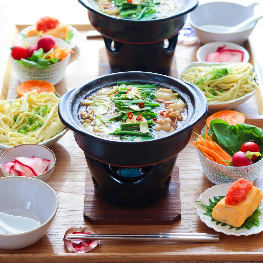 ꕤ もつ鍋 ꕤ 赤かぶの甘酢漬け ꕤ 卵焼き明太子乗せ ꕤ 野菜サラダ ꕤ 〆ちゃんぽん ꕤ フルーツ 大好きなもつ鍋✨ キャベツたっぷり入れて。 〆のちゃんぽん麺もおいしかった……🤤❤️