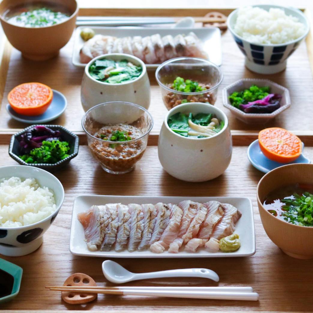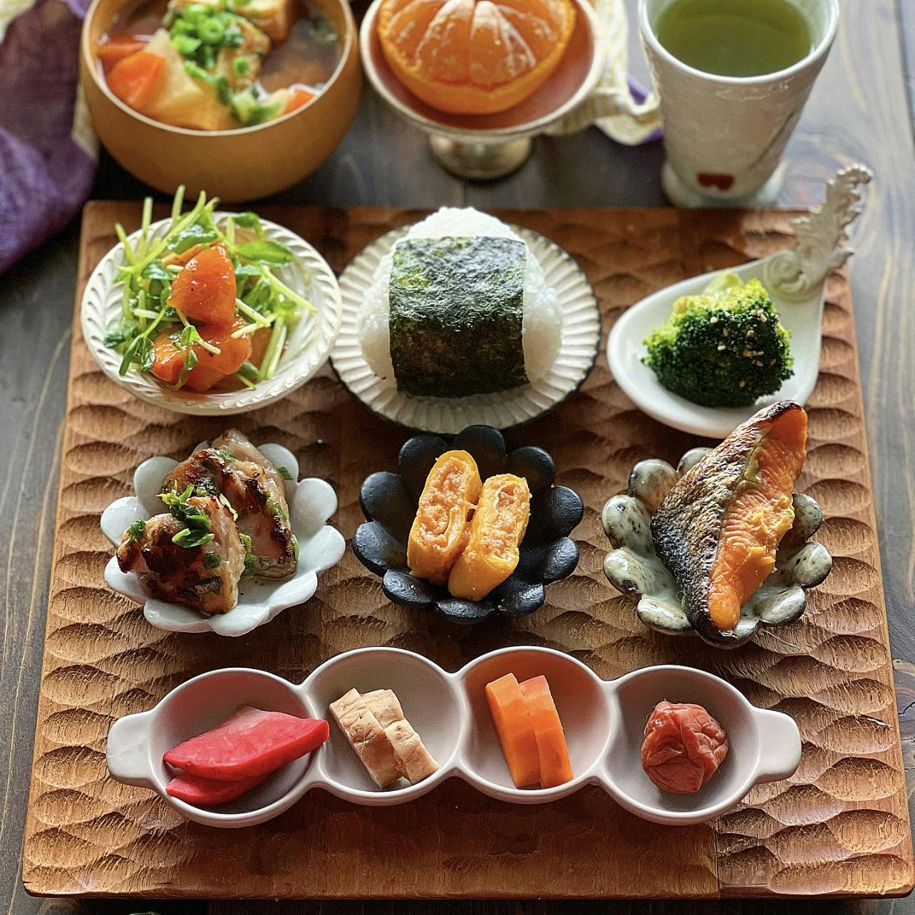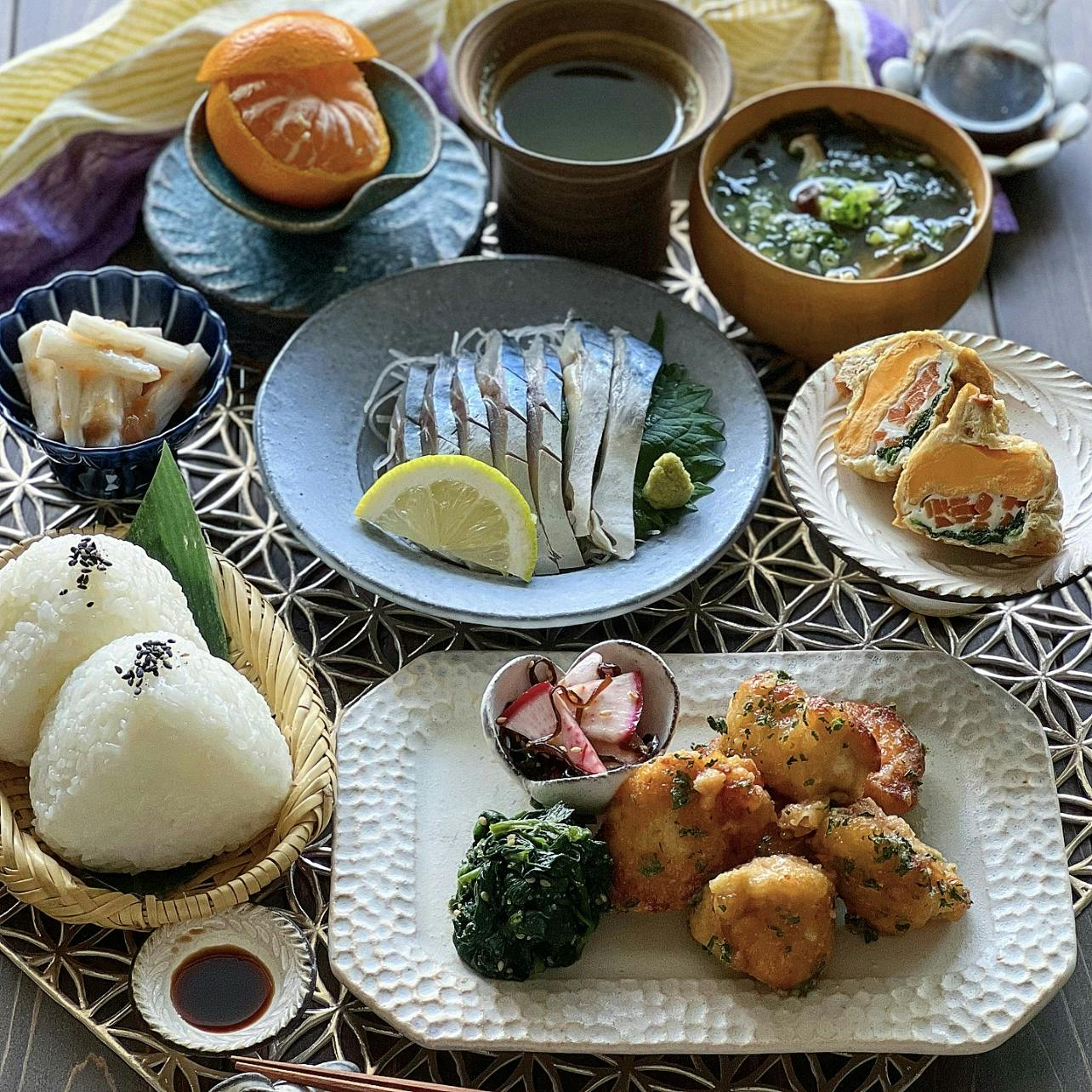 #和定食風ごはん ❁ 塩おにぎり ❁ しめ鯖 ❁ 鶏胸肉のマヨ磯辺唐揚げ ❁ ほうれん草の胡麻和え ❁ 赤かぶの胡麻昆布和え ❁ 彩り卵の袋煮 ❁ 長芋の梅干し和え ❁ 木の子入りぬるねばスープ ❁ みかん🍊 お肉もお魚もあると満足感ありますね。 彩り袋煮にはほうれん草とにんじんで。 塩おにぎりの塩は #ろく助の塩 を使っています。 昆布、干椎茸、干帆立貝が入ってるから旨み調味料で とても美味しいのでおすすめです。
