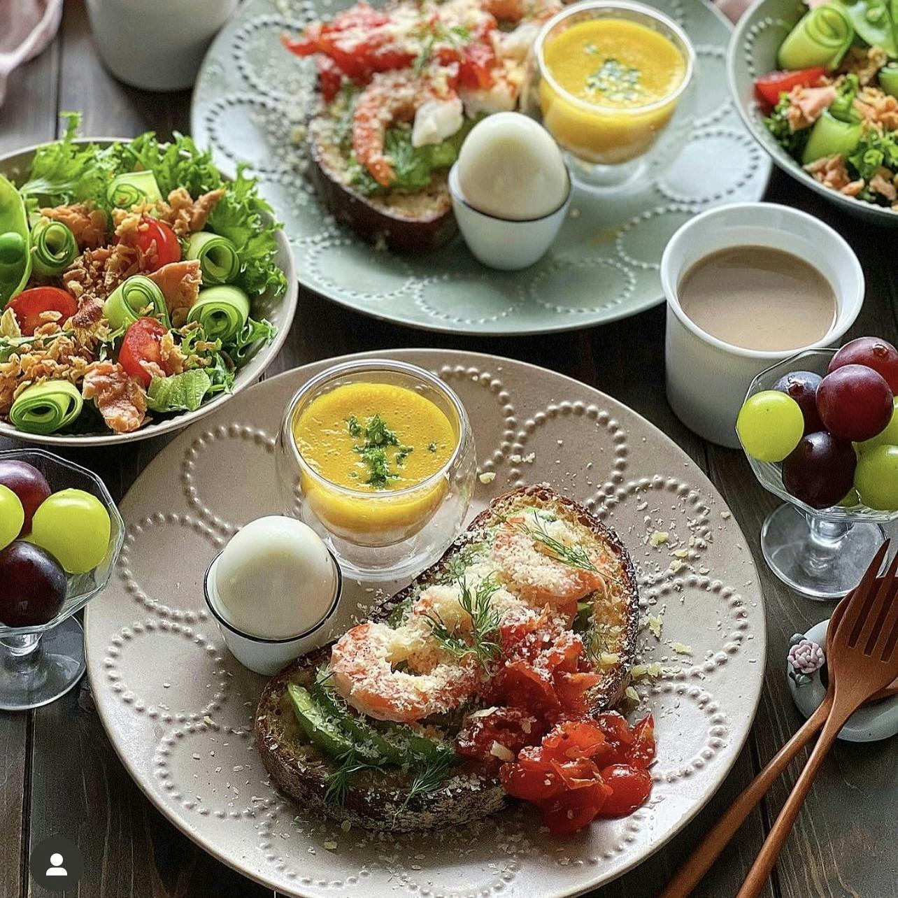 #ワンプレート朝ごはん 🍞🥚🥗 ❁︎ 海老とアボカドの焦がしマヨのオープンサンド ❁︎ ゆで卵 ❁︎ かぼちゃのポタージュ ❁︎ お花畑風サラダ ❁︎ シャインマスカットと巨峰 ❁︎ カフェオレ たっぷりマヨネーズを塗って 茹でた海老とアボカドを乗せて焼きました。 たっぷりのチーズとディルとトマトのマリネを トッピング。 オープンサンドは簡単でボリューミーになって いいですね♬ サラダはレタス、きゅうり、ミニトマト、鮭、 フライドオニオン、そしてスナップエンドウ。 ちょっとお花畑風にしてみました。