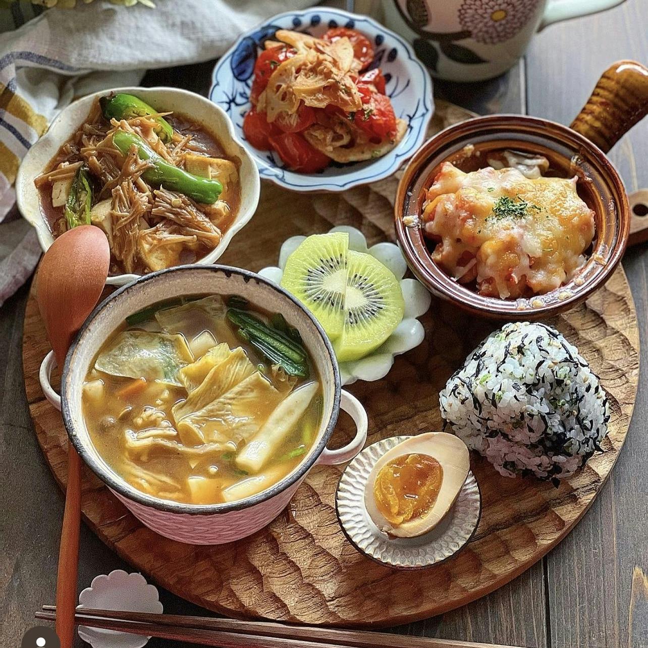 #お盆ごはん ❁ 湯葉と切り干し大根のピリ辛酸辣湯 ❁ 麻婆なめ茸 ❁ れんこんとトマトのマリネ ❁ 長芋とトマトとナスの味噌チーズ焼き ❁ ひじきのおにぎり ❁ 味玉 ❁ キウイ🥝 今日の献立はスープがメインなんです。 湯葉と切り干し大根の入ったピリ辛の和風スープ。 ピリ辛は体も温まりますよね。 麻婆なめ茸は手作りなめ茸で作っています。 片栗粉を入れなくてもなめ茸でとろみがつくので goodです。