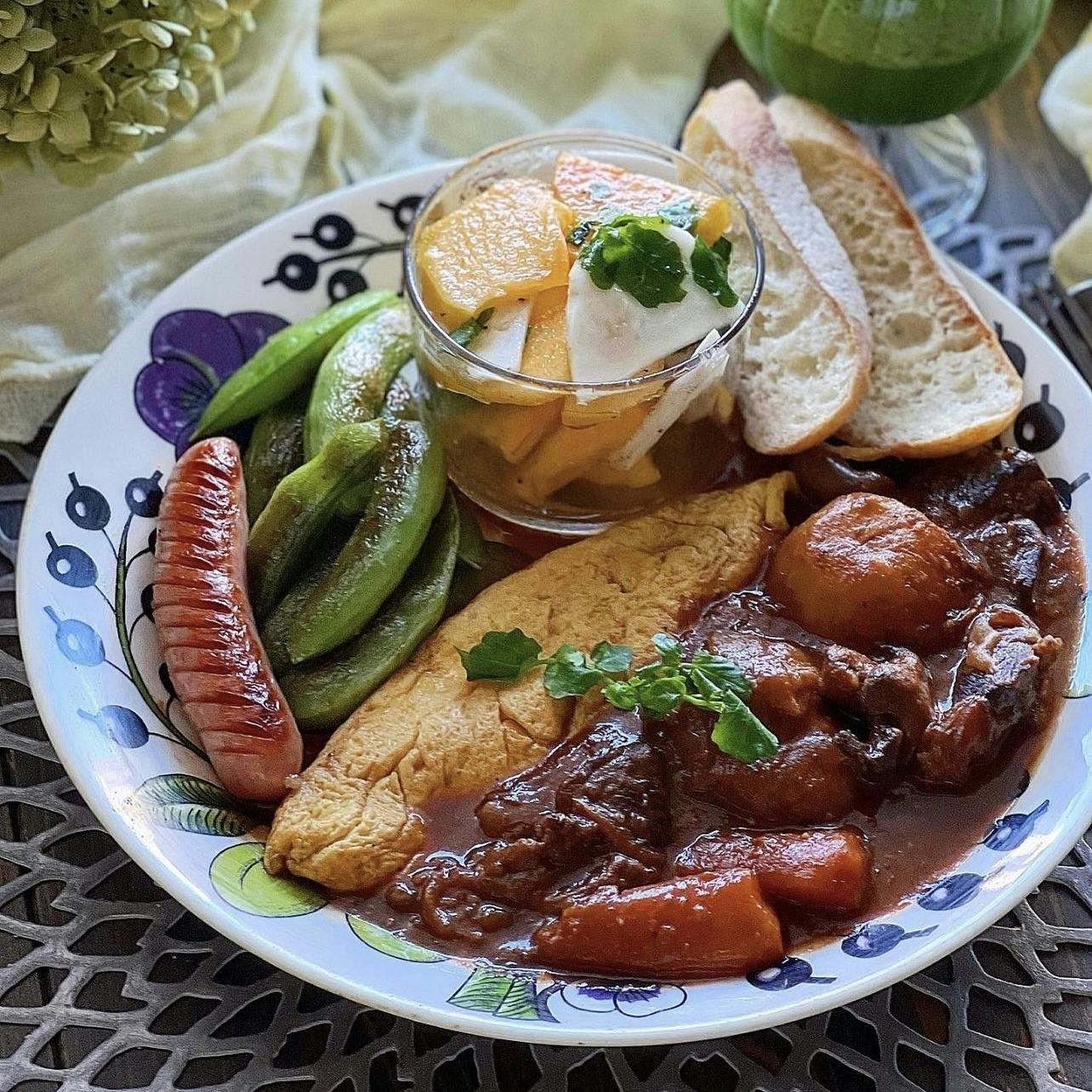 #ビーフシチュープレート ❁ オムビーフシチュー ❁ 柿と蕪のマリネサラダ ❁ スナップエンドウのバターソテー ❁ ソーセージ ❁ パン ❁ 小松菜とりんごとバナナのスムージー トロトロのビーフシチューにオムレツを合わせて オムビーフシチューに。 シャキシャキのスナップエンドウのバターソテーも 美味しいですよね。