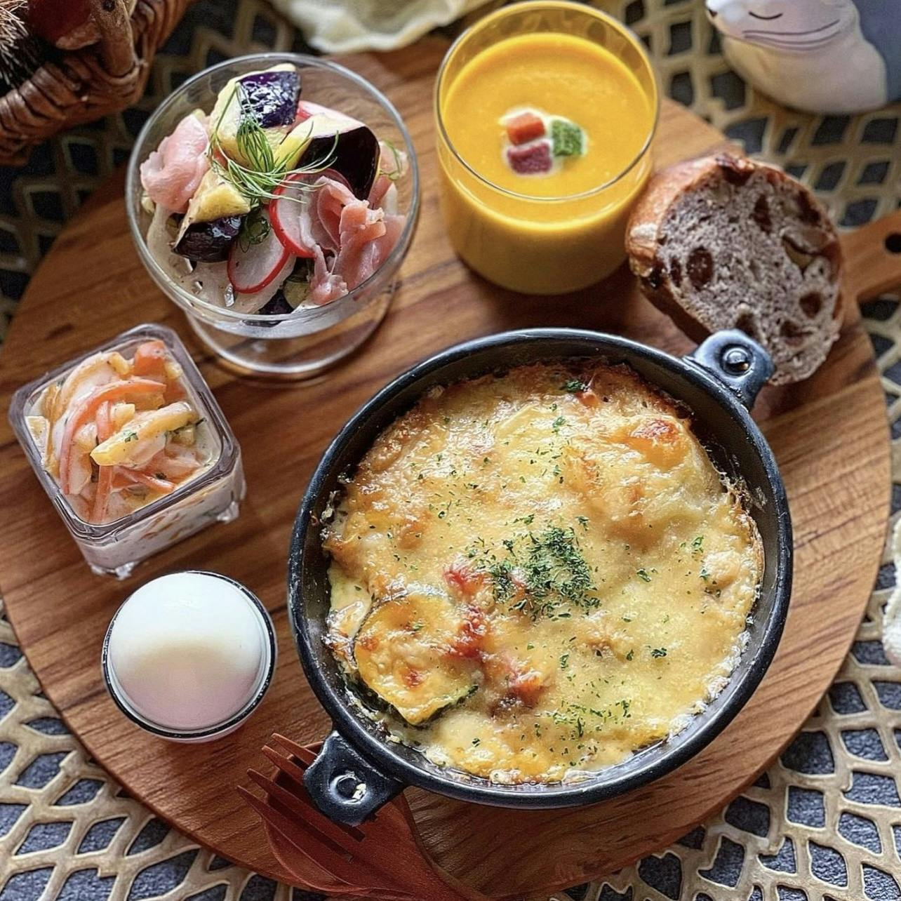 チーズたっぷりの厚切りベーコンとズッキーニのドリア。 使っているのはコンテチーズ🧀 そのまま食べても加熱しても美味しい。 ❁ ベーコンとズッキーニのチーズドリア ❁ 茄子と生ハムとラデッシュのマリネ ❁ にんじんとパプリカ柿のヨーグルトサラダ ❁ ボイルドエッグ ❁ かぼちゃのポタージュ ❁ くるみとレーズンブレッド