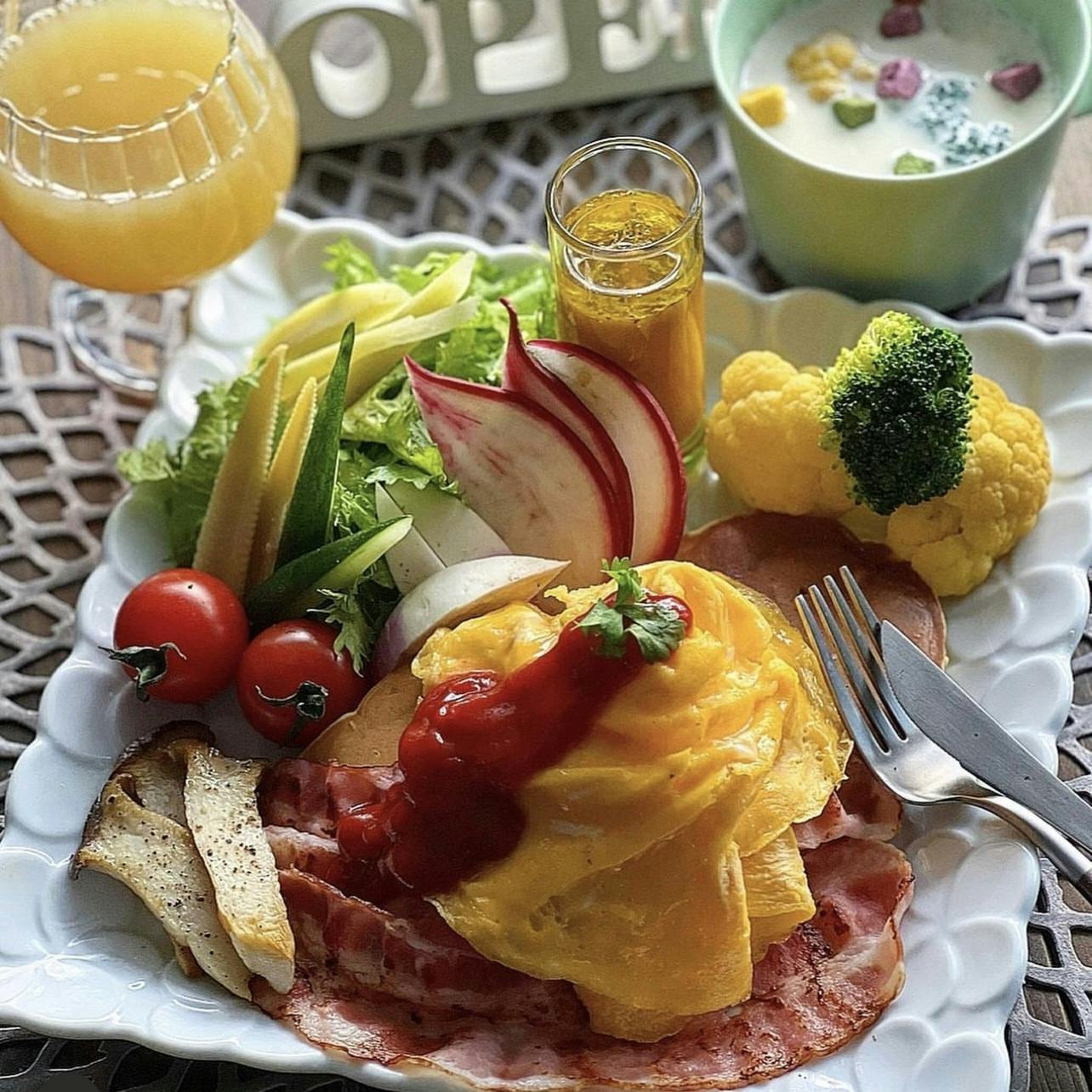 ドレスドオムライスのように見えますがドレス卵と焼きベーコンを乗せた甘くないお食事系のパンケーキです🥞 エリンギステーキ、フレッシュサラダ、ボイルブロッコリーを添えたお野菜いっぱいのワンプレート朝ごはん。 ❁ ベーコンと卵のパンケーキ ❁ エリンギのステーキ ❁ 彩りサラダと2色の茹でブロッコリー ❁ 残り野菜とSOVE入りのミルクスープ ❁ りんごジュース