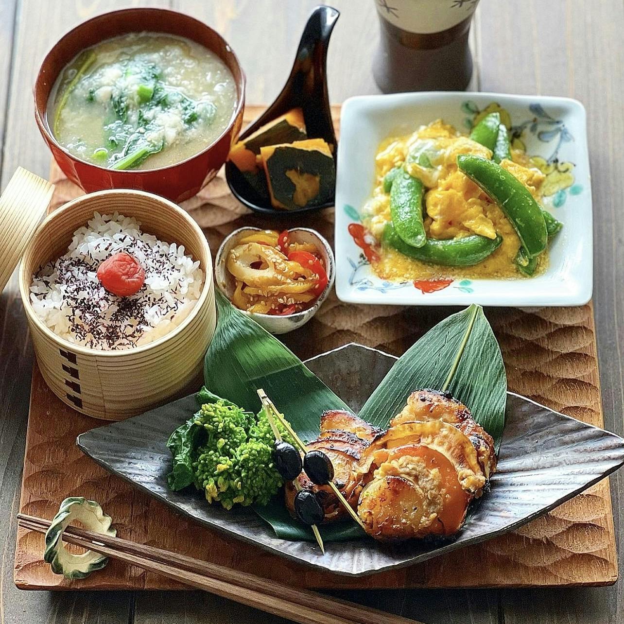 ❁ ホタテの西京焼き 菜の花のおひたし 黒豆の煮方 ❁ スナップエンドウのトロ玉炒め ❁ ちくわとパプリカのきんぴら ❁ かぼちゃの煮物 ❁ 赤紫蘇ごはん ❁ 長芋のすりおろし味噌汁 スナップエンドウに卵を合わせた炒め物は簡単にサッとできて彩りも良く美味しいですね♡ 菜の花にすりおろした長芋を落とした すりおろし味噌汁も身体に染みて美味しいです。
