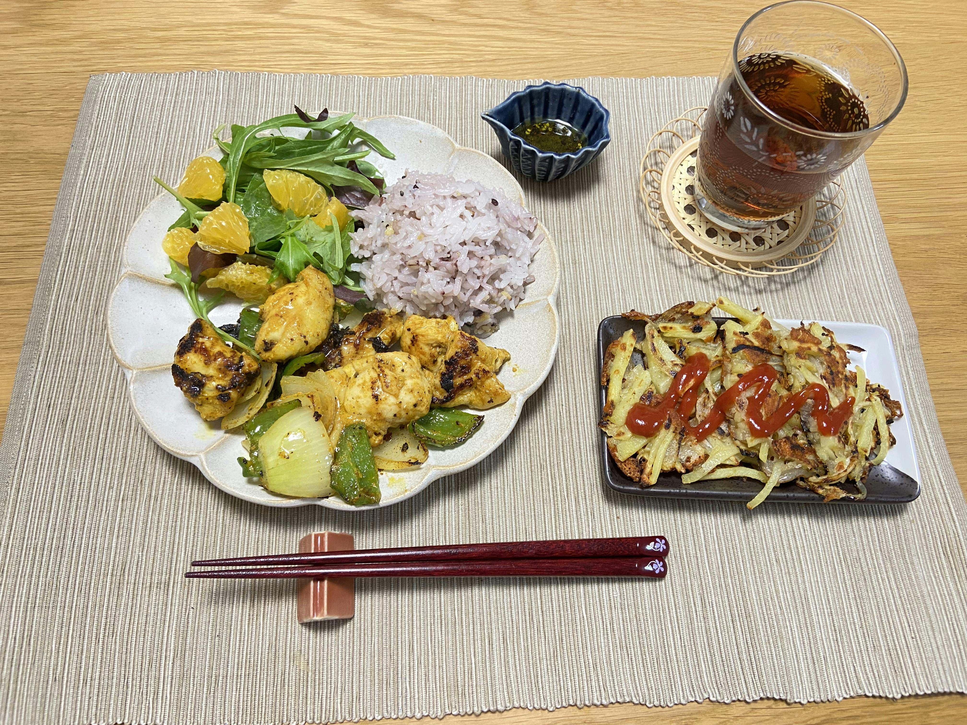 タンドリーチキンのカレー風味って食欲湧きますよね🤭 つい食べ過ぎてしまうのでお米は雑穀米にして、八朔サラダでサッパリ🥗✨ そしてじゃがいものチーズガレット🧀 SNSで見かけて気になってたので試してみたけど、見た目がイマイチだ😅 味はとっても美味しいんだけど何が悪かったのかなぁ🤔